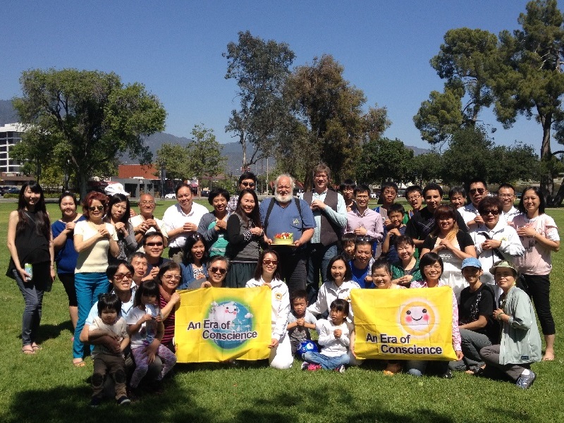 John Selfridge (Middle in blue) celebrated his 67th birthday with families and friends in Arcadia, California. The whole group showed their support to the movement of An Era of Conscience by hand gestures.