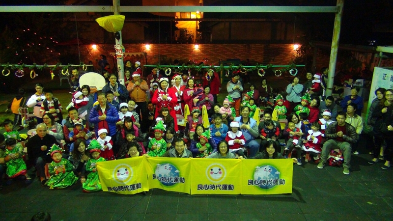 青欣幼兒園園長張芳霞女士(中)於12月24日耶誕晚會活動時,邀請與會的家長們一同響應良心時代運動,希望人人發自內心做好事、說好話,讓社會更祥和、更幸福!!
