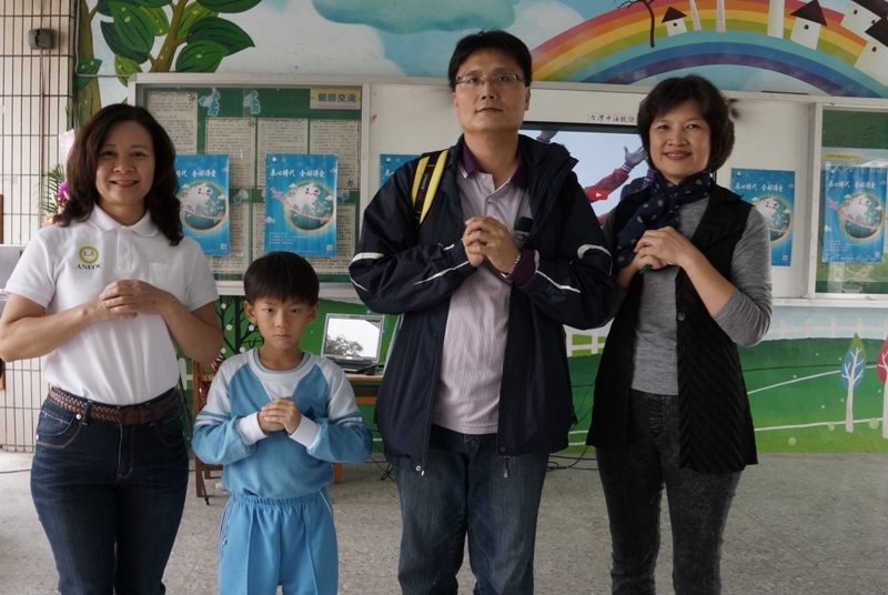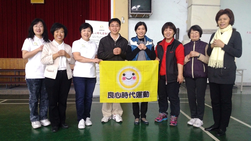 位於桃園市八德區的茄苳國小校長謝雅莉(中)帶領訓導主任張振松(左二)一同響應良心時代運動並表示愛與包容足以點亮全世界。