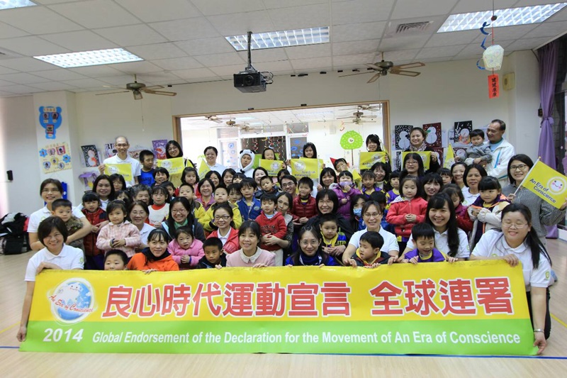 小飛鼠幼兒園創辦人兼執行長許穎華〈左三〉,特別重視培養小朋友帶得走的能力,尤其是正確得價值觀。園長蔡宜君〈左二〉希望孩子都能充滿愛與關懷,他們也都希望讓愛充滿世界。因此也熱情響應良心時代運動宣言全球連署。