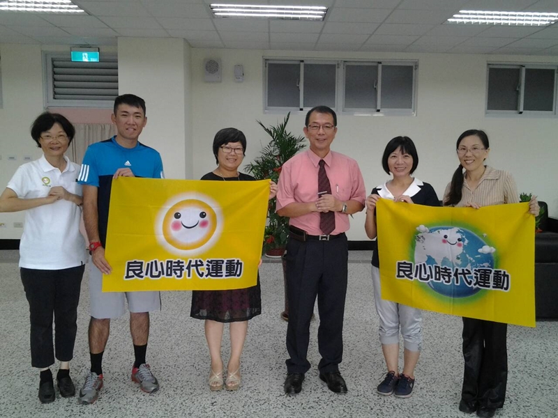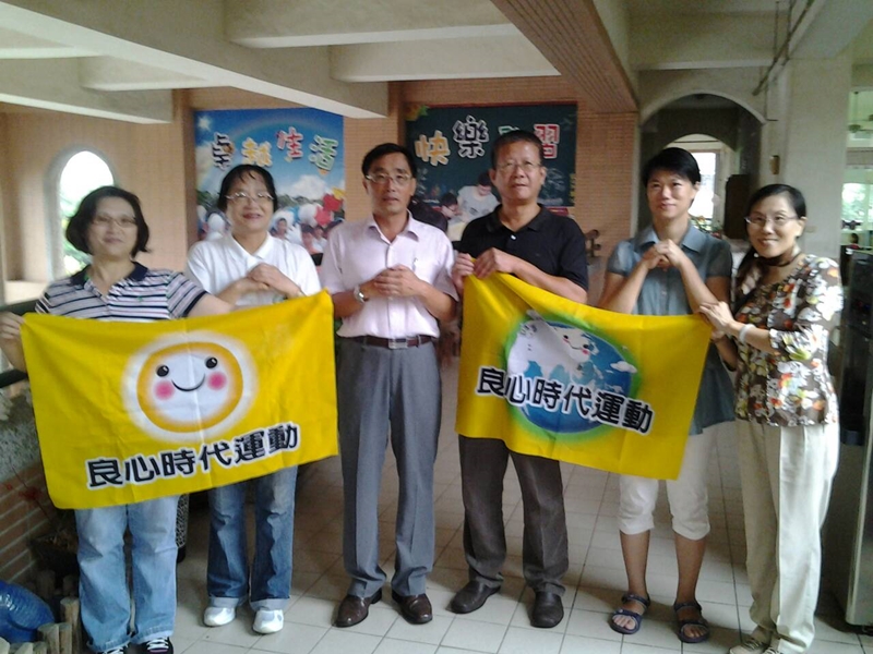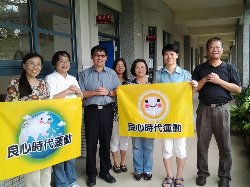 高雄市岡山區前峰國小簡木全校長(左三)響應良心時代運動,他表示良心運動其實是該校教育的重點,除引導小朋友存好心、說好話、做好事外,也推廣「心」的品格運動----服務,就是出自內心幫助身邊每個人做好事,希望社會更和諧、更圓滿,世界共榮、人類永續,讓大家快樂幸福的生活在世界上。