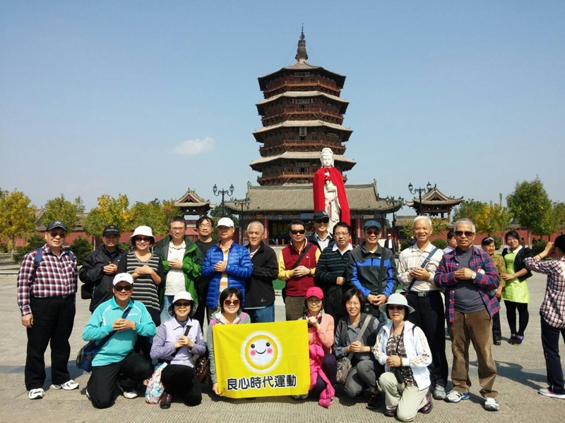 明台保險經理許協聖(前左一)邀約好友一同響應良心時代運動。在山西應縣木塔前,期許在各自工作崗位上謹守本分做良心事。