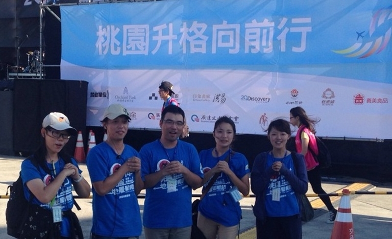 桃園縣文化局表演科王啟仲科長(正中間)與同仁在桃園地景藝術節共同響應良心時代運動, 王科長期待將桃園打造一個愛與祥和的地方, 用真心關懷周遭每一個人.