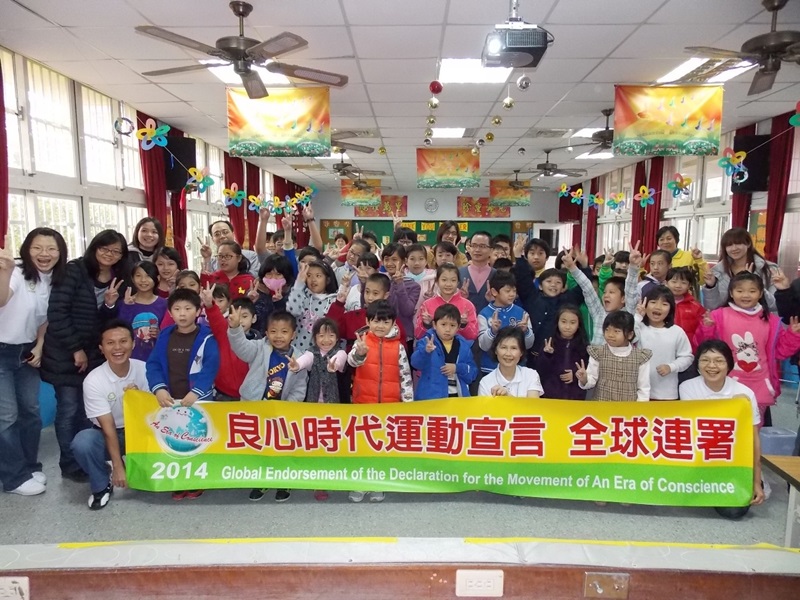 位於大溪鎮偏遠的瑞祥國小是所溫馨的小學,全校師生像個大家庭,大家長彭裕晃校長(中立)帶著全校師生一起響應良心時代運動。期許透過良心時代運動小朋友更能隨時守護好心中的小天使