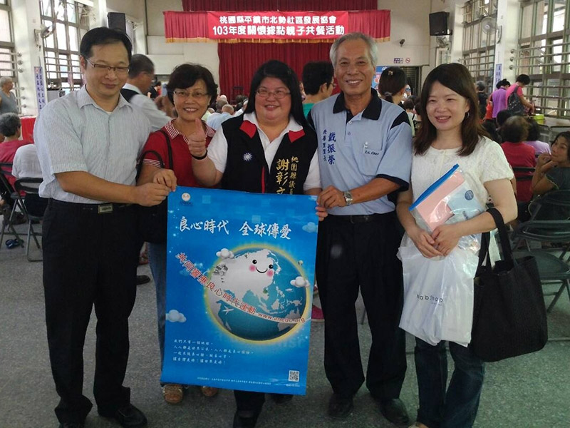 北勢社區發展協會理事長戴振榮(左二)與縣議員謝彰文(中)與「良心時代運動」義工合影。
