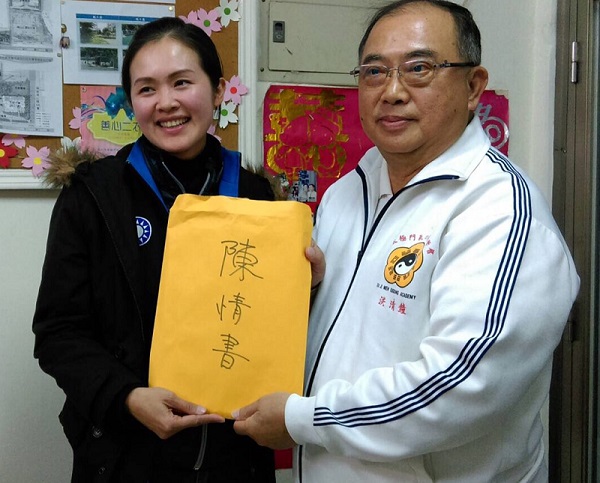 | 新北市議會洪佳君議員接受太極門弟子代表陳情書。 | |