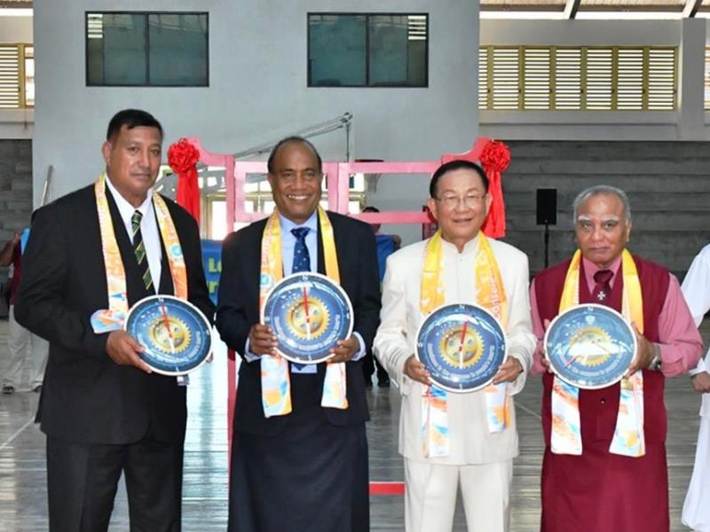 | 2019年7月12日在吉里巴斯的首都塔拉瓦市,洪博士(第一排,右二)致贈(由左到右)英國女王駐庫克群島代表Tom Marsters爵士, 吉里巴斯Maamau總統,與吉里巴斯國會議長Uaai良心指南鐘,象徵鼓勵人人時時遵循良心。 |