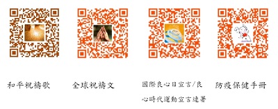| 《和平祝禱歌》、《全球祝禱文》、「國際良心日宣言」、「良心時代運動宣言」、「防疫保健手冊」QR code |