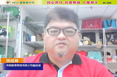 和朝創意開發有限公司總經理孫成育表示,創業以來就以與員工、客戶、廠商共好為經營理念,所以任何決策都是以發展長期有意義的關係,為最高指導原則,以ESG為企業永續發展的目標,因為「利他則無障礙」,在這個共好的基礎上,大家就不會去追逐私利,公司自然就一片祥和,成為能留住人才的幸福企業。曾經以為離戰爭很遠的他表示,沒想到俄烏戰爭造成全球系統性的風暴,也影響到自己,影響所有人,導致商業不興,農業不振。在全球祝禱的活動,以最誠心的期盼,希望大家秉持良心,從自己做起,把良心連結起來傳出去,秉持良心傳承和平,達成地球永續。