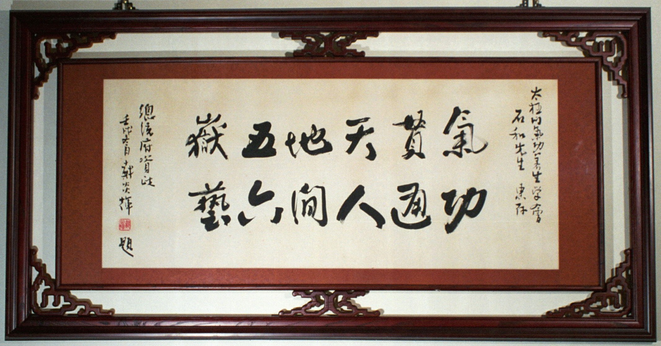 前副總統連戰頒贈「太極門氣功養生學會」巨型匾額:「太極門是一個氣功練武的門派,修身、練氣,我想它的淵源來自我們中華的文化,尤其是教忠教孝、愛國家、愛社會,這是我們當前最需要的基本的價值觀念。」
