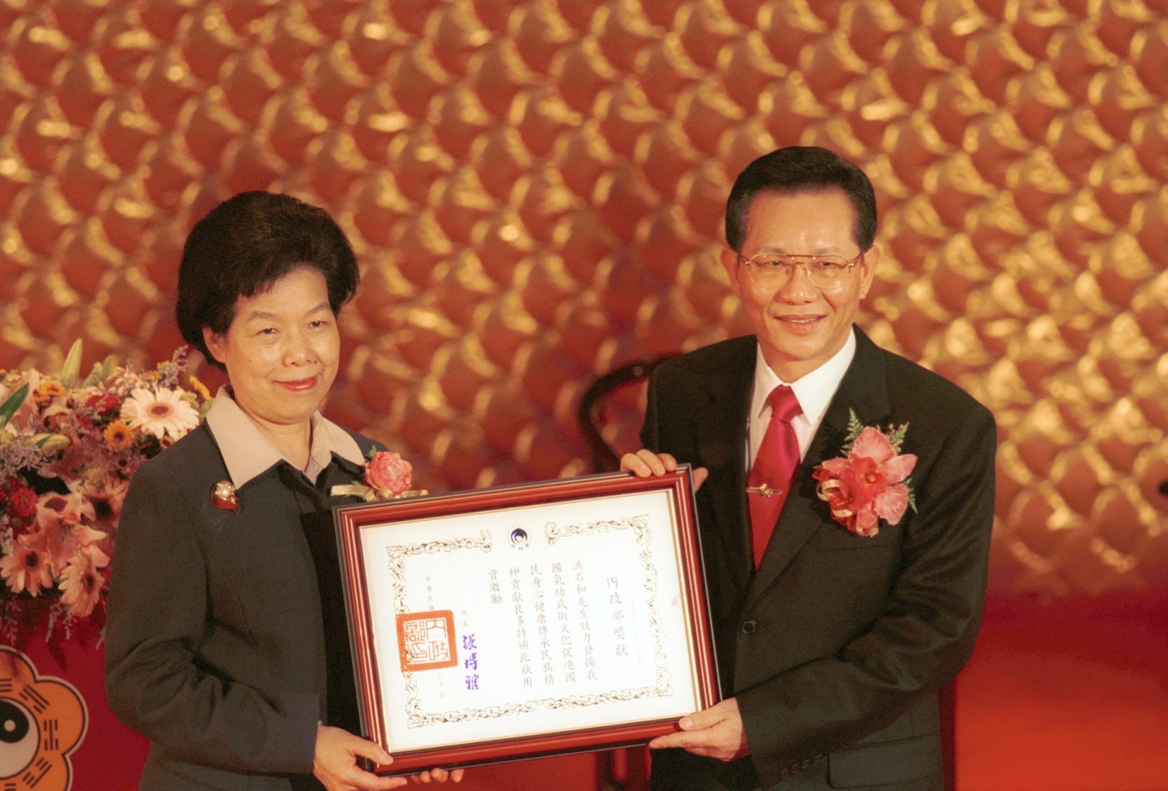 | 2002年當時內政部長張博雅女士頒贈洪博士內政部獎狀,讚譽太極門讓全國的藝術文化提昇到國際舞台 | |