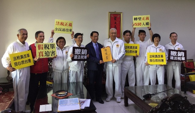 | 太極門新竹道館弟子王安祿等10人,拜會前立委呂學樟(左五)並遞交陳情書,希望傾力督促權責機關依法終結冤稅,以維法制、保障人權。 |